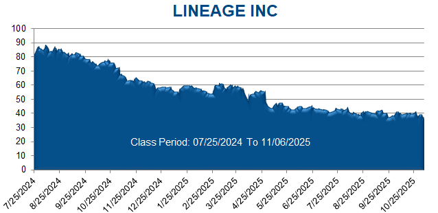 A securities class action has been filed against Lineage, Inc. (LINE) on behalf of all persons or entities that purchased or otherwise acquired Lineage common stock pursuant and/or traceable to the Offering Documents issued in connection with the IPO, between july 25, 2024 through november 6, 2025. This case has been filed in the USDC – EDMI.