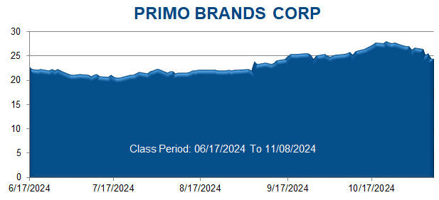 A securities class action has been filed against Primo Brands Corporation (PRMB) on behalf of all persons or entities who purchased or acquired (i) the common stock of Primo Water between June 17, 2024 through November 8, 2024. This case has been filed in the USDC – CT.