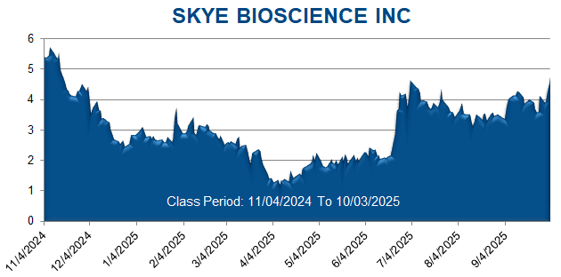 A securities class action has been filed against Skye Bioscience, Inc. (SKYE) on behalf of a class consisting of all persons and entities other than Defendants that purchased or otherwise acquired Skye securities between November 4, 2024 through October 3, 2025. This case has been filed in the USDC – SDCA.