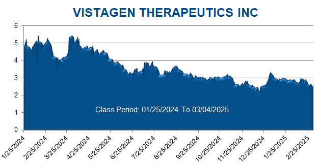 A securities class action has been filed against Vistagen Therapeutics, Inc. (VTGN) on behalf of persons and entities that purchased or otherwise acquired Vistagen securities between January 25, 2024 through March 4, 2025. This case has been filed in the USDC – NDCA.